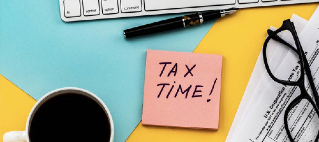 tax forms on desk with calculator, pen and eyeglass